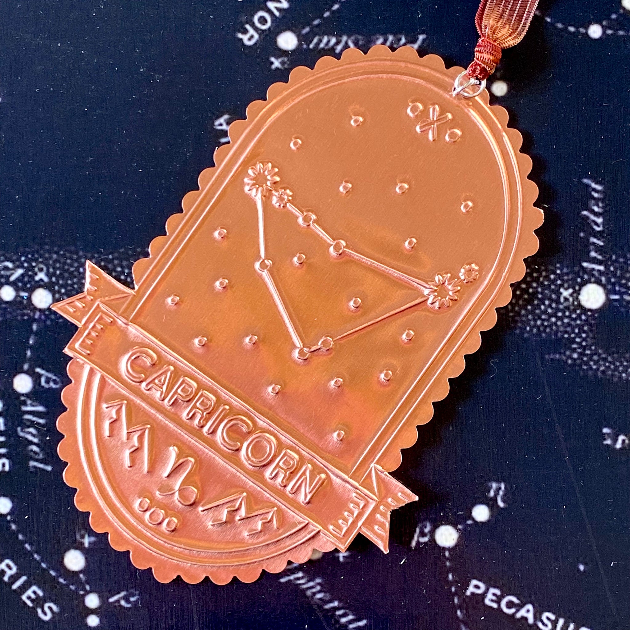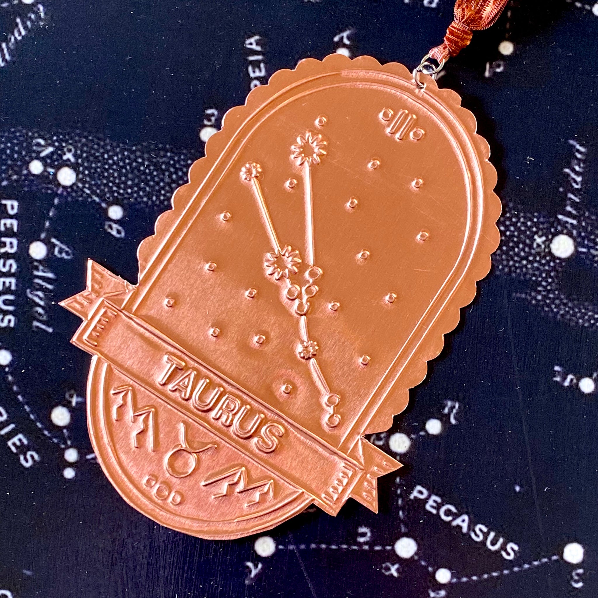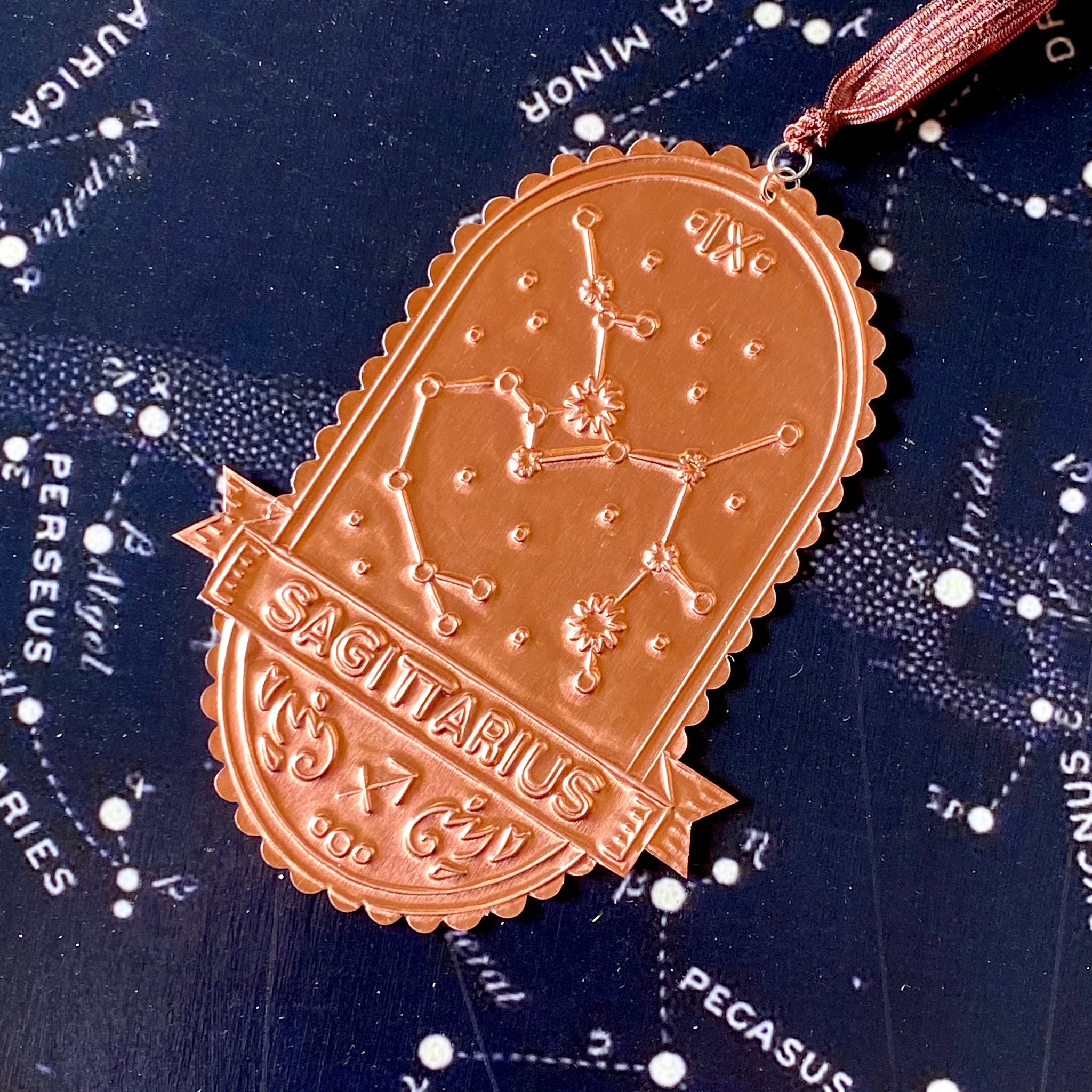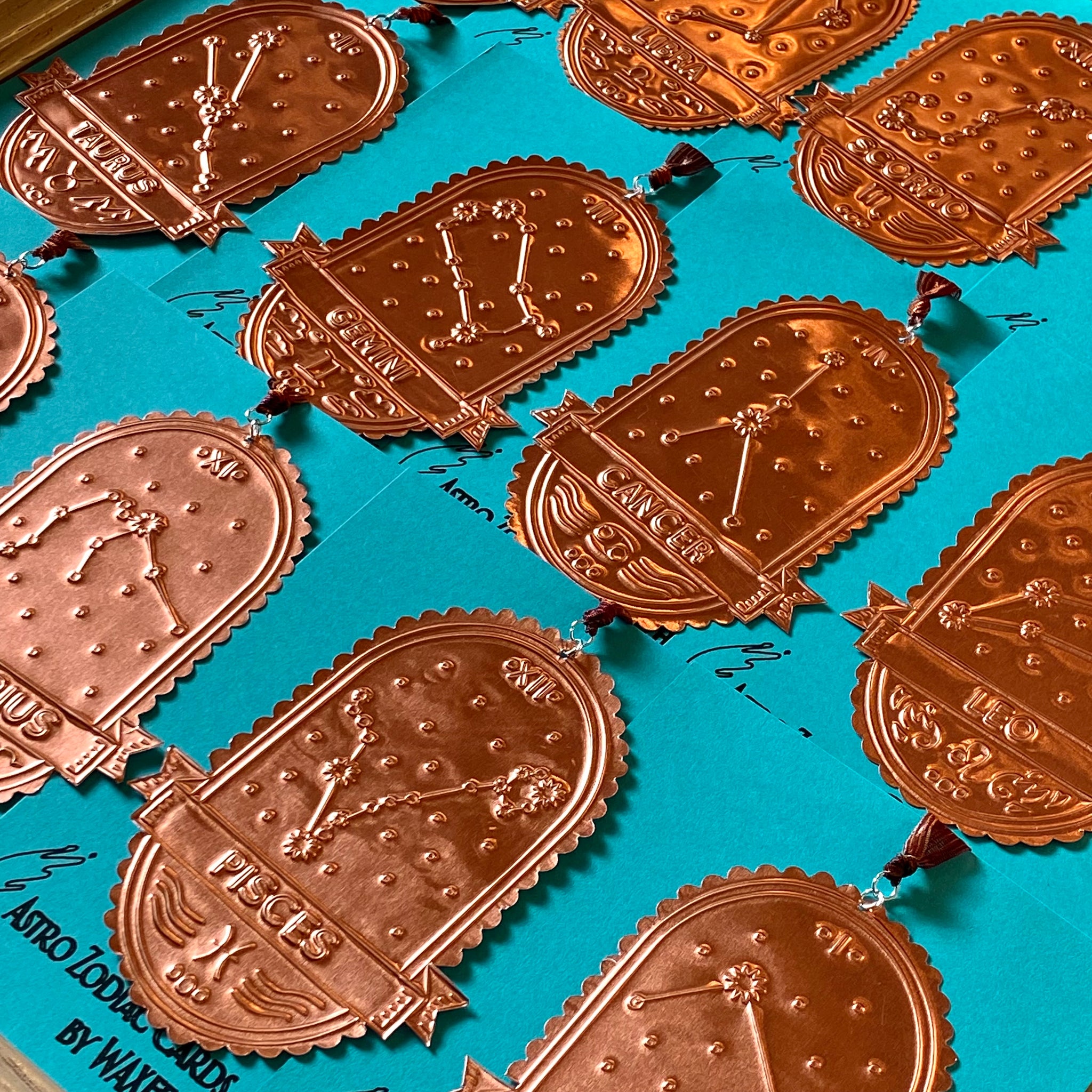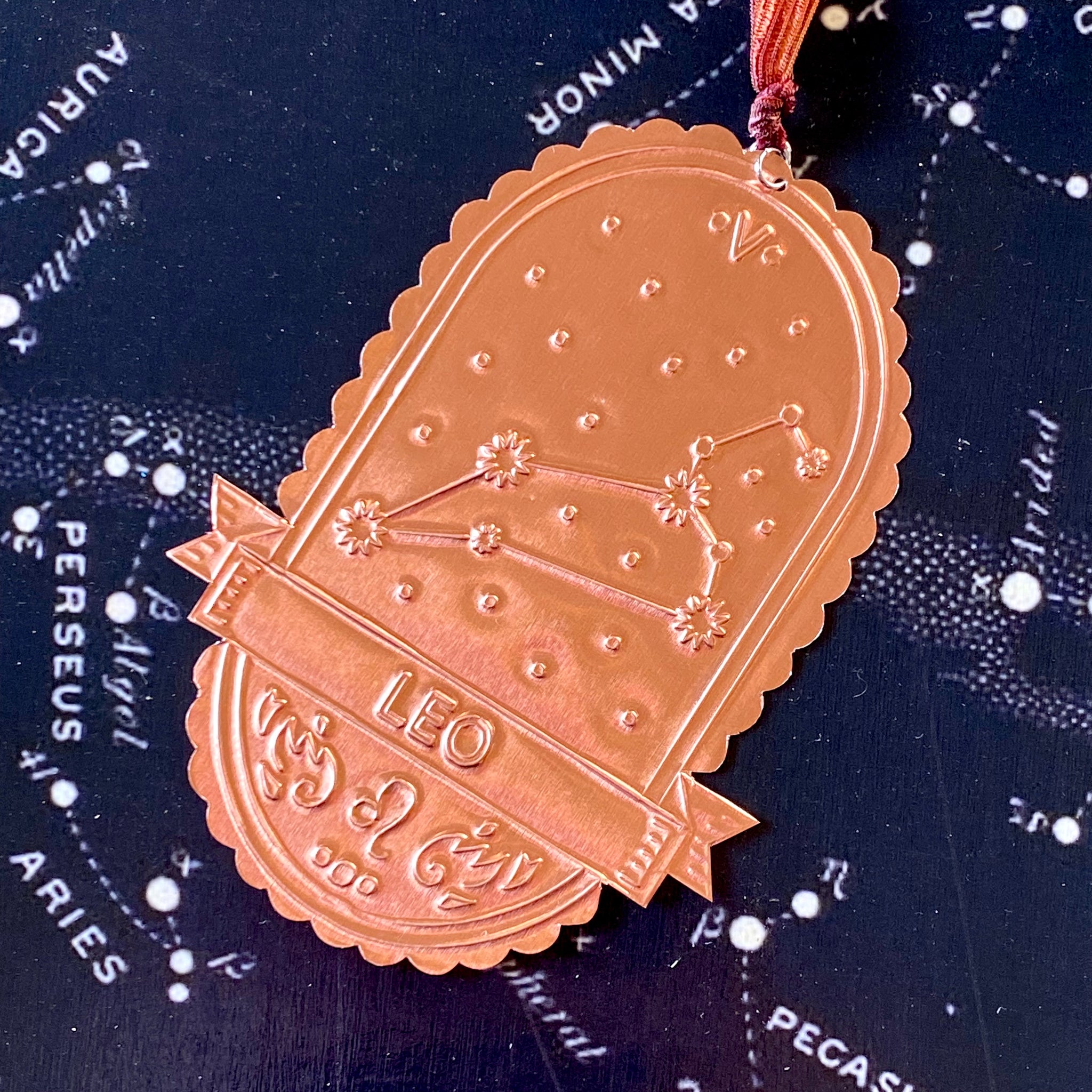 Individually hand-drawn and handcrafted, each lightweight copper-tinted aluminum milagro is one-of-a-kind! Milagros have a long history, frequently used as charms to promote health, well-being, luck or protection. Made right here in Tucson by Zoë of Waxfeather, these feature the constellations of the astrological zodiac!