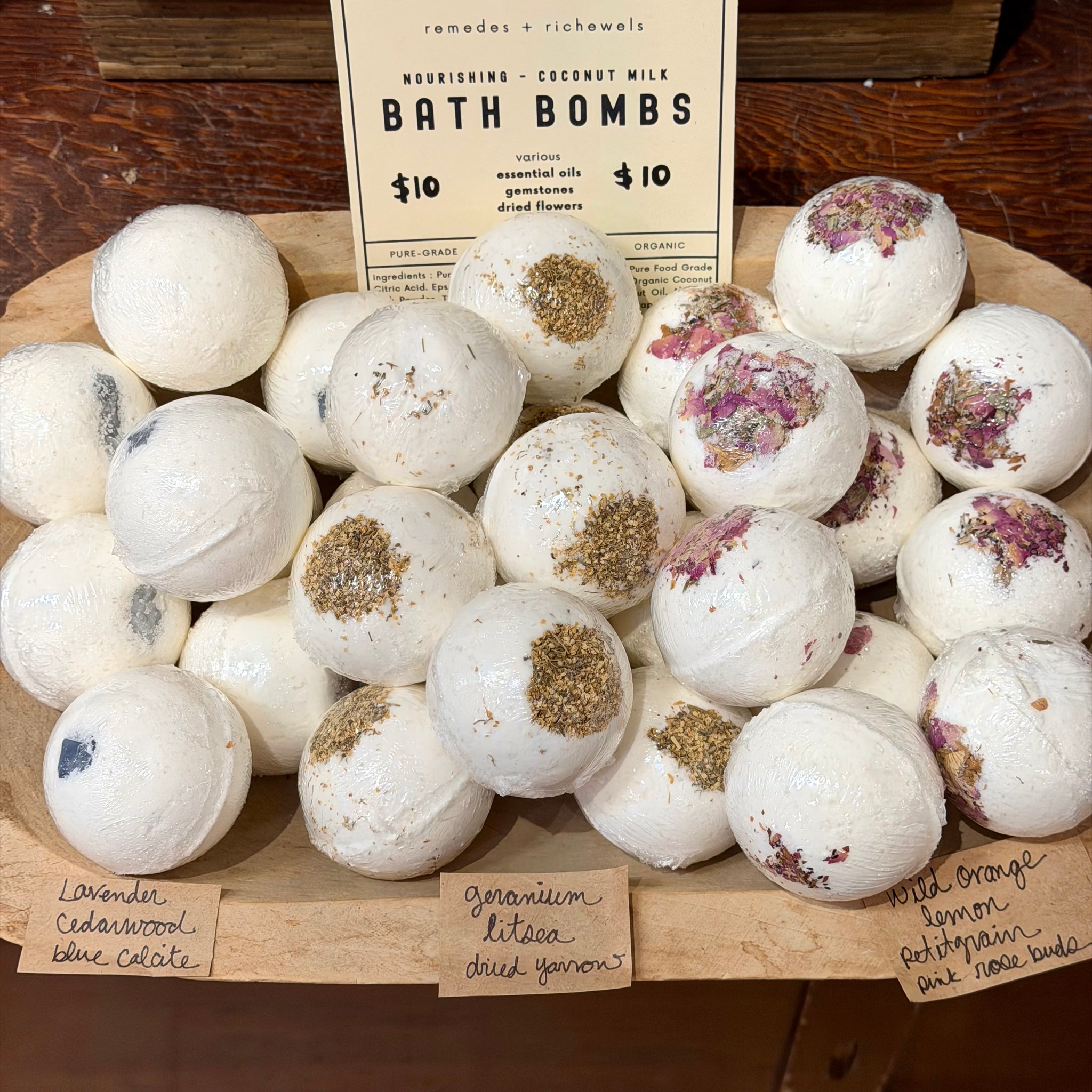 Handmade organic bath bombs by local maker Teryn of Remedes + Richewels! Made with nourishing coconut milk, and various essential oils, dried flowers, and even gemstones.