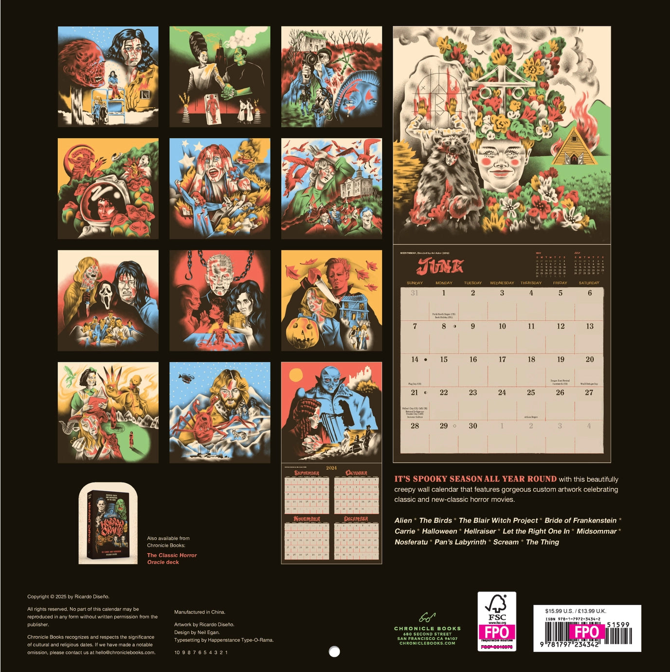 It’s spooky season all year round with this beautifully creepy wall calendar featuring gorgeous custom artwork that celebrates classic and new-classic horror movies. From genre-defining films like the original Halloween and Hellraiser, to the eerie menace of Let the Right One In, to the modern shocker Midsommar, each movie is unforgettably illustrated by celebrated artist and horror movie fan Ricardo Diseño. 24-pages 12 x 12 inch month-by-month calendar THIRTEEN FANTASTIC IMAGES: Twelve monthly images, plus one for Sept–Dec 2025 at a glance. FEATURED FILMS: Alien * The Birds * The Blair Witch Project * Bride of Frankenstein * Carrie * Halloween * Hellraiser * Let the Right One In * Midsommar * Nosferatu * Pan’s Labyrinth * Scream * The Thing PLASTIC-FREE MATERIALS: 100% plastic-free packaging and product.