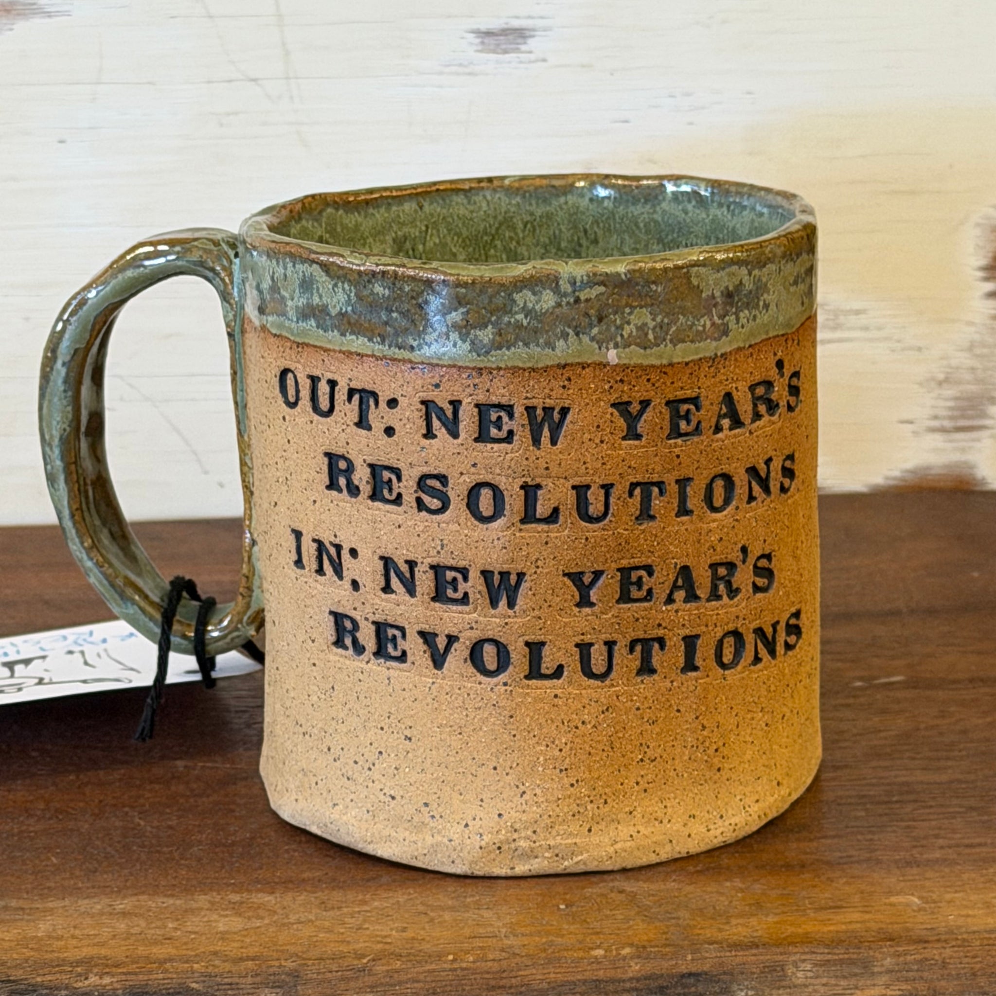 New Year's Revolution mug proceeds go to the Florence Immigrant And Refugee Rights Project. Full text reads: "Out: New Year's Resolutions In: New Year's Revolutions"