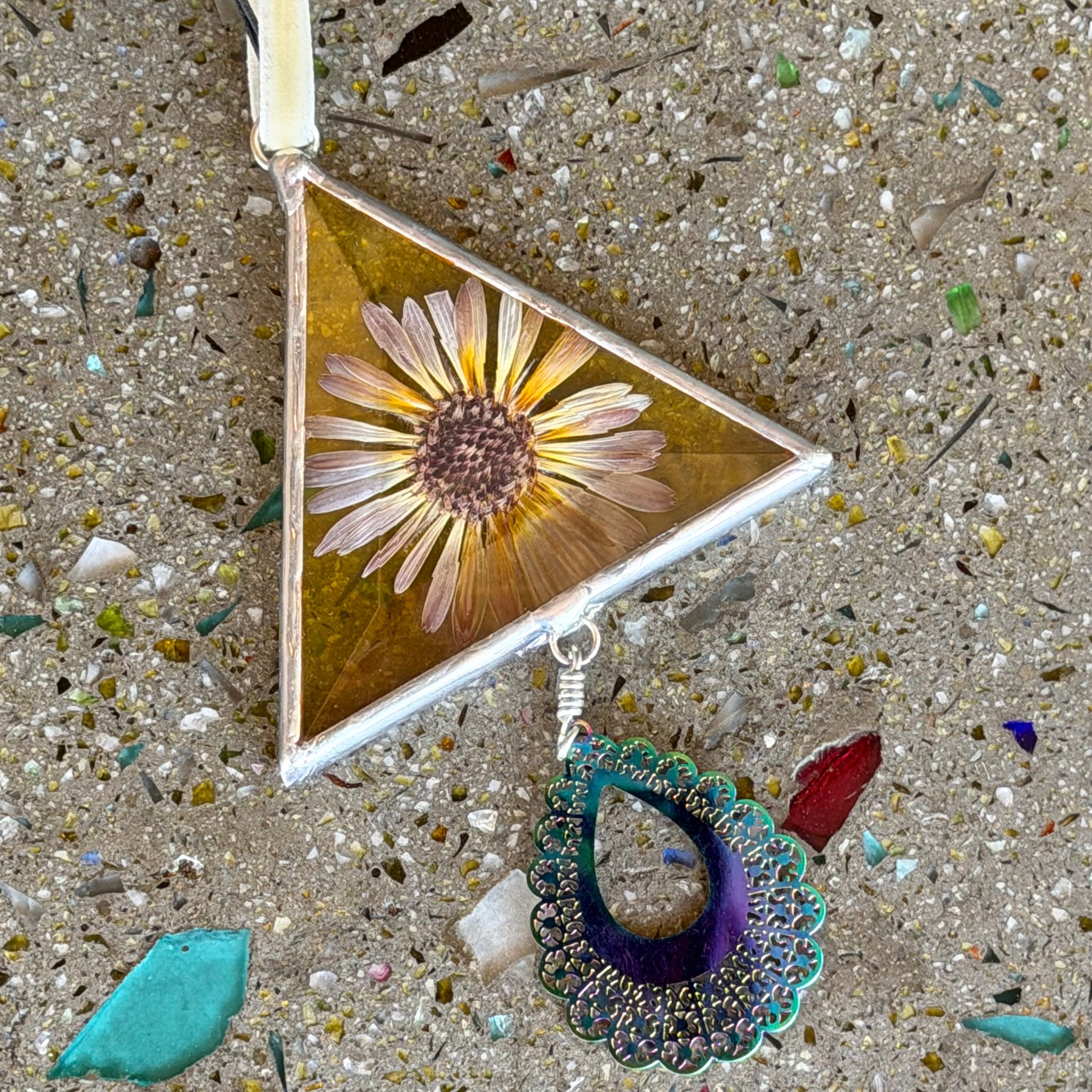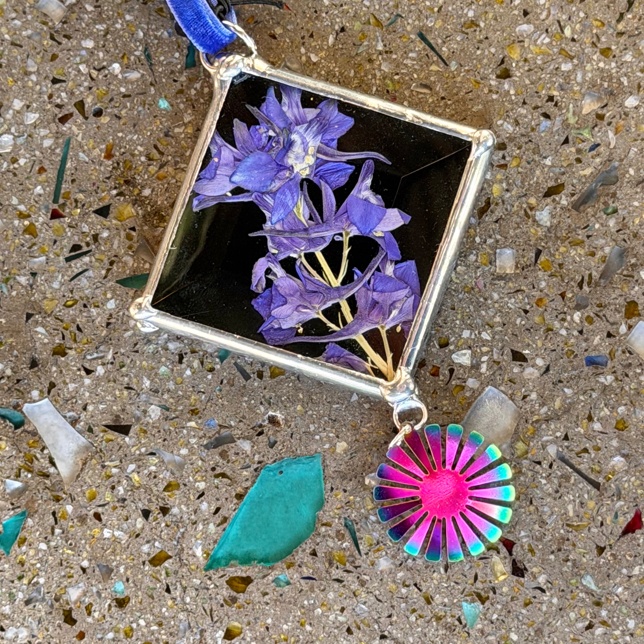 Each of these gorgeous glass ornaments features unique pressed flowers from the artist's own garden! Double layered glass allows the backing to be made opaque, perfect for hanging on a tree, or anywhere with a busy background, or translucent, great for hanging in a window to catch the light. Handmade here in Tucson by Alex of Goodness Glass.