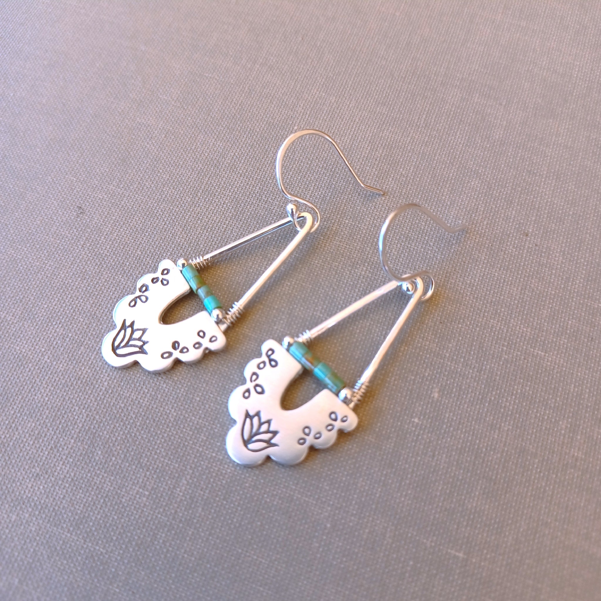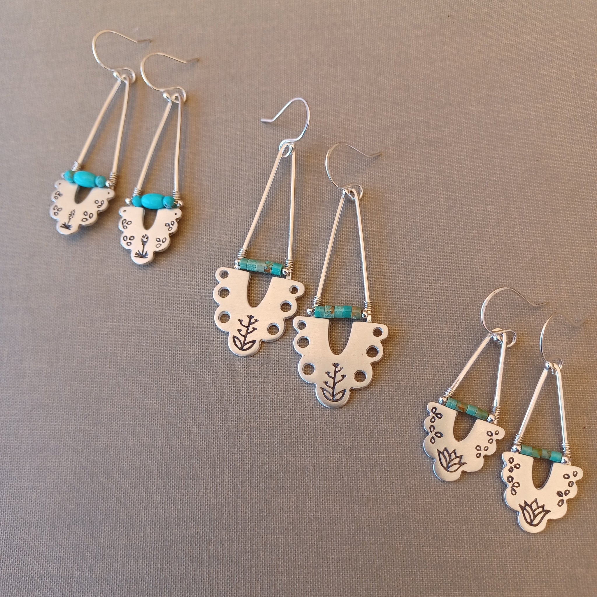Lightweight, ornate and with a classic papel picado design, these sterling silver earrings are one-of-a-kind! Featuring hand carved details and turquoise accents, their unique triangular shape is eye-catching with a simple elegance. Handmade right here in Tucson by Celeste of Cactus Bloom Design!