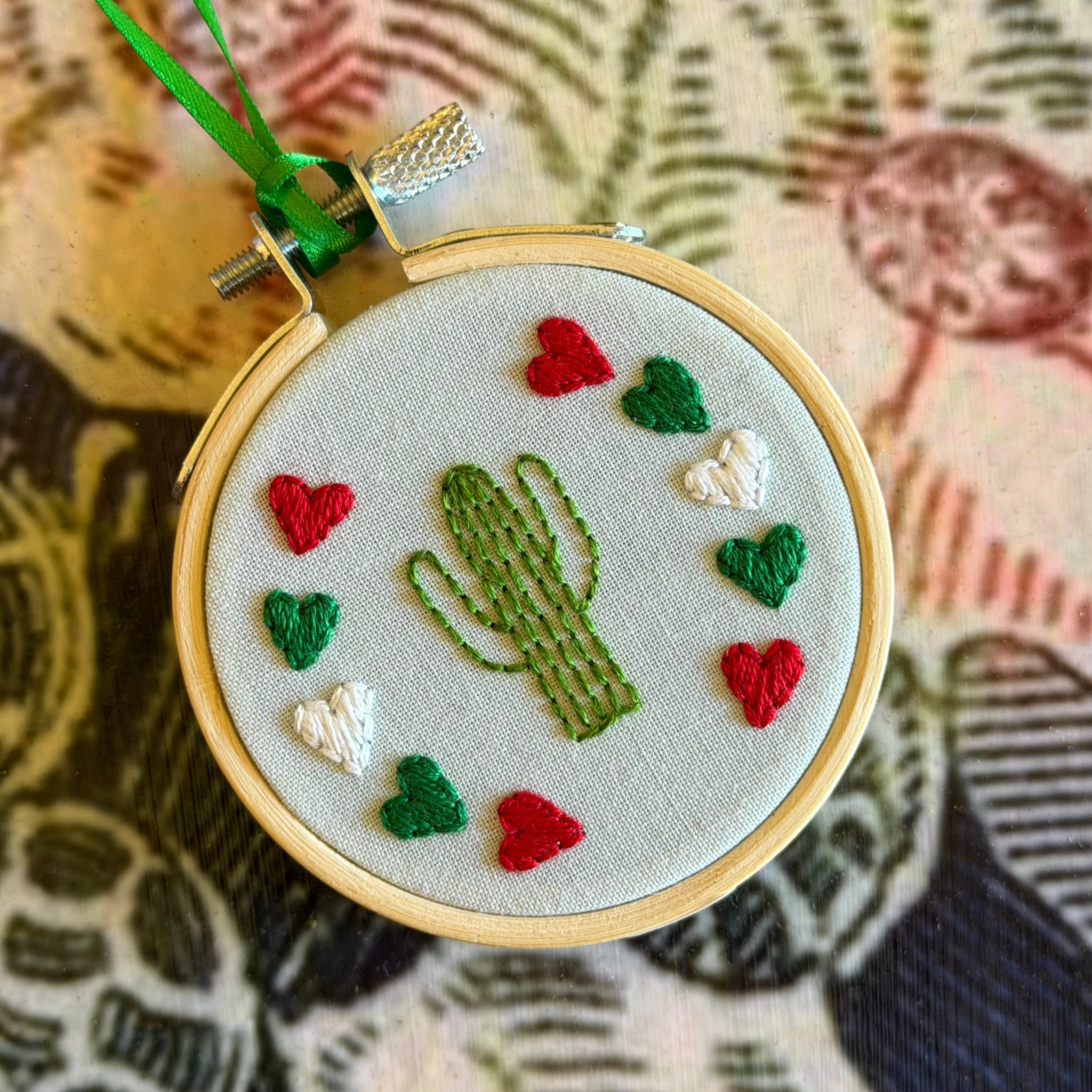 Cute hand stitched hoops to adorn your tree, or hang on the wall for decor wherever you need a pop of color! They work great propped on a shelf as well! These come in a variety of color variations, and make a great gift.