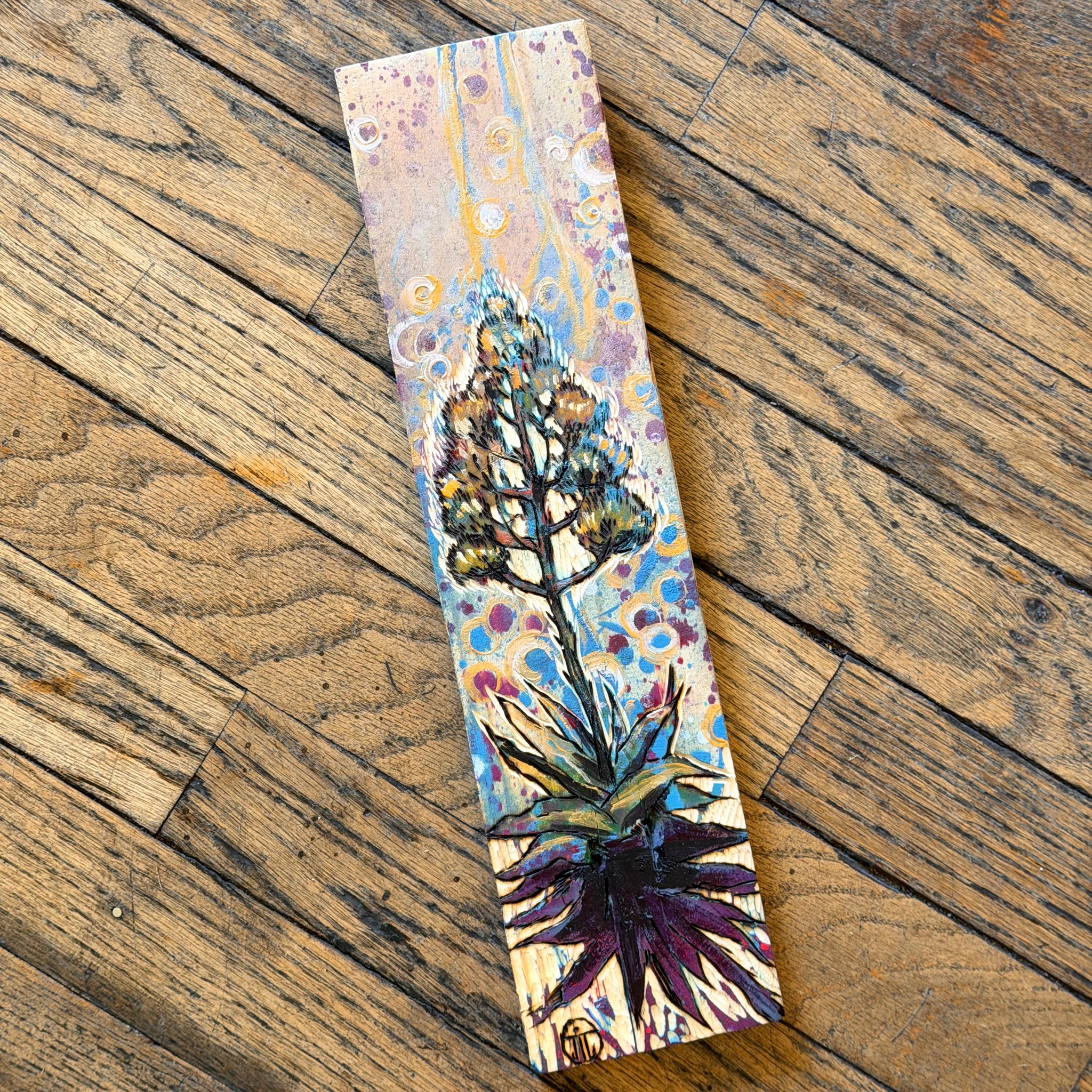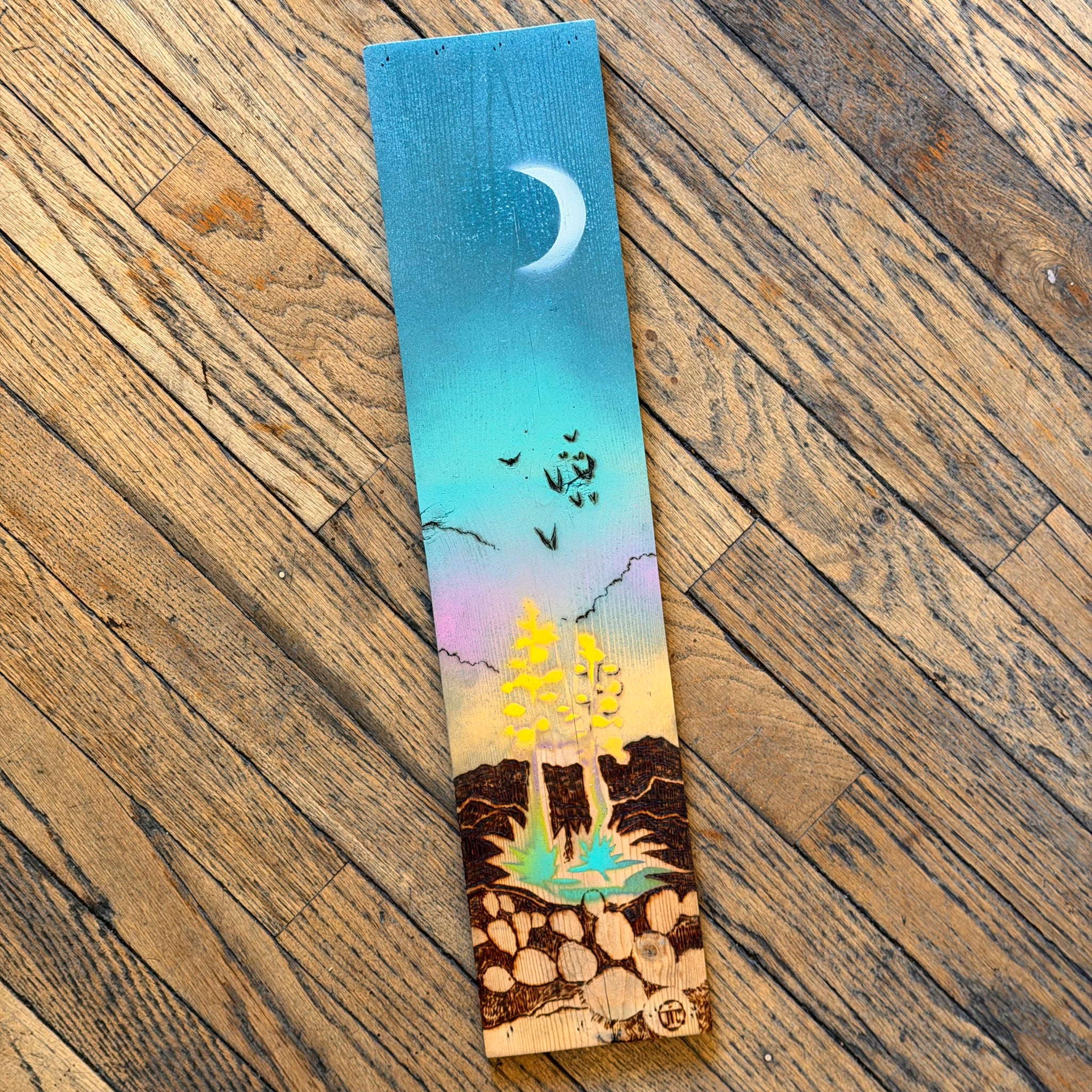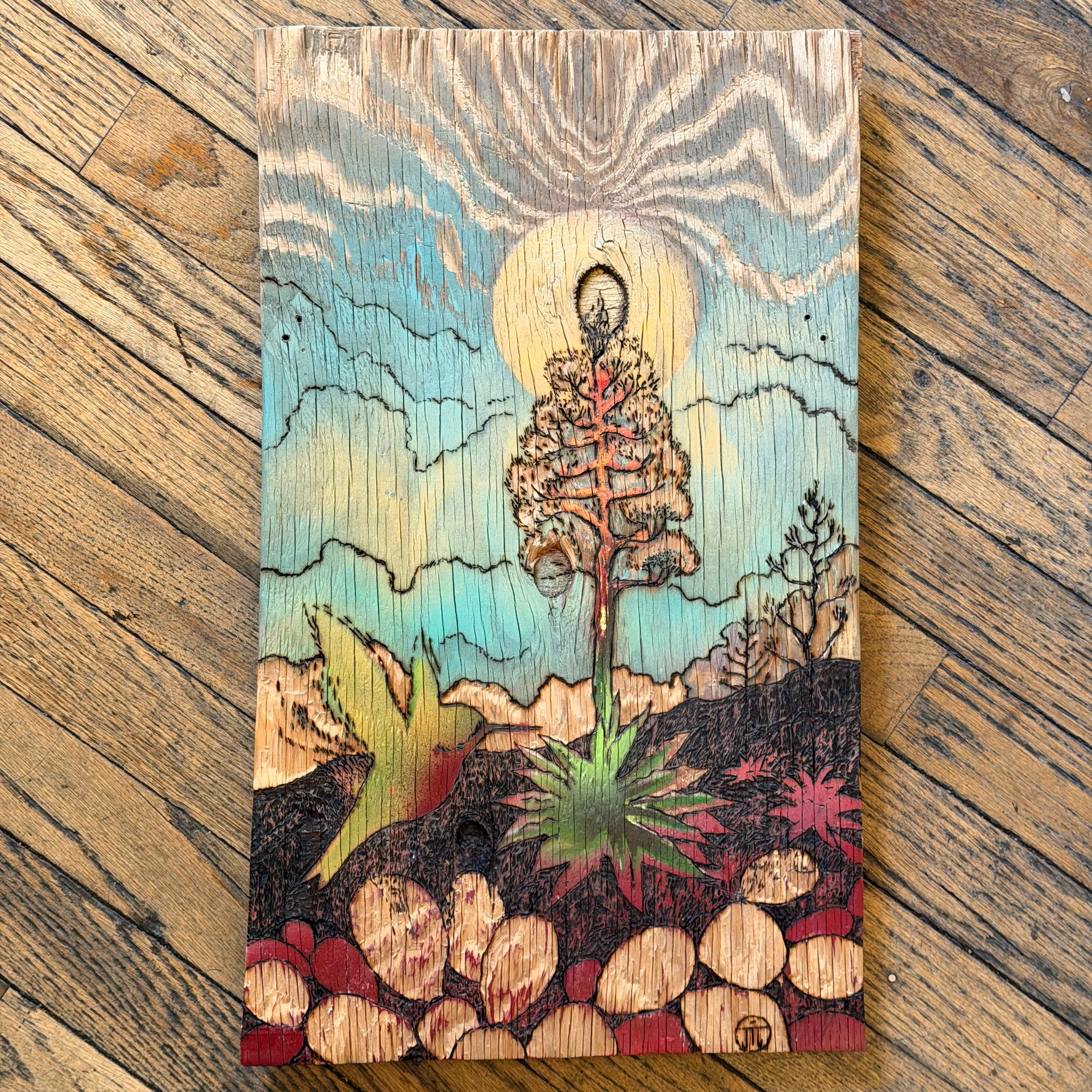 A stunning celebration of the Sonoran desert and it's iconic flora, these arresting pyrography pieces are entirely hand crafted by local artists Joe Marshall and Josephine Thomason! Made with reclaimed local woods, hand carved, painted, and burned, each piece is truly one of a kind. Joe does all the carving and pyrography artwork after Josephine paints the wood piece.