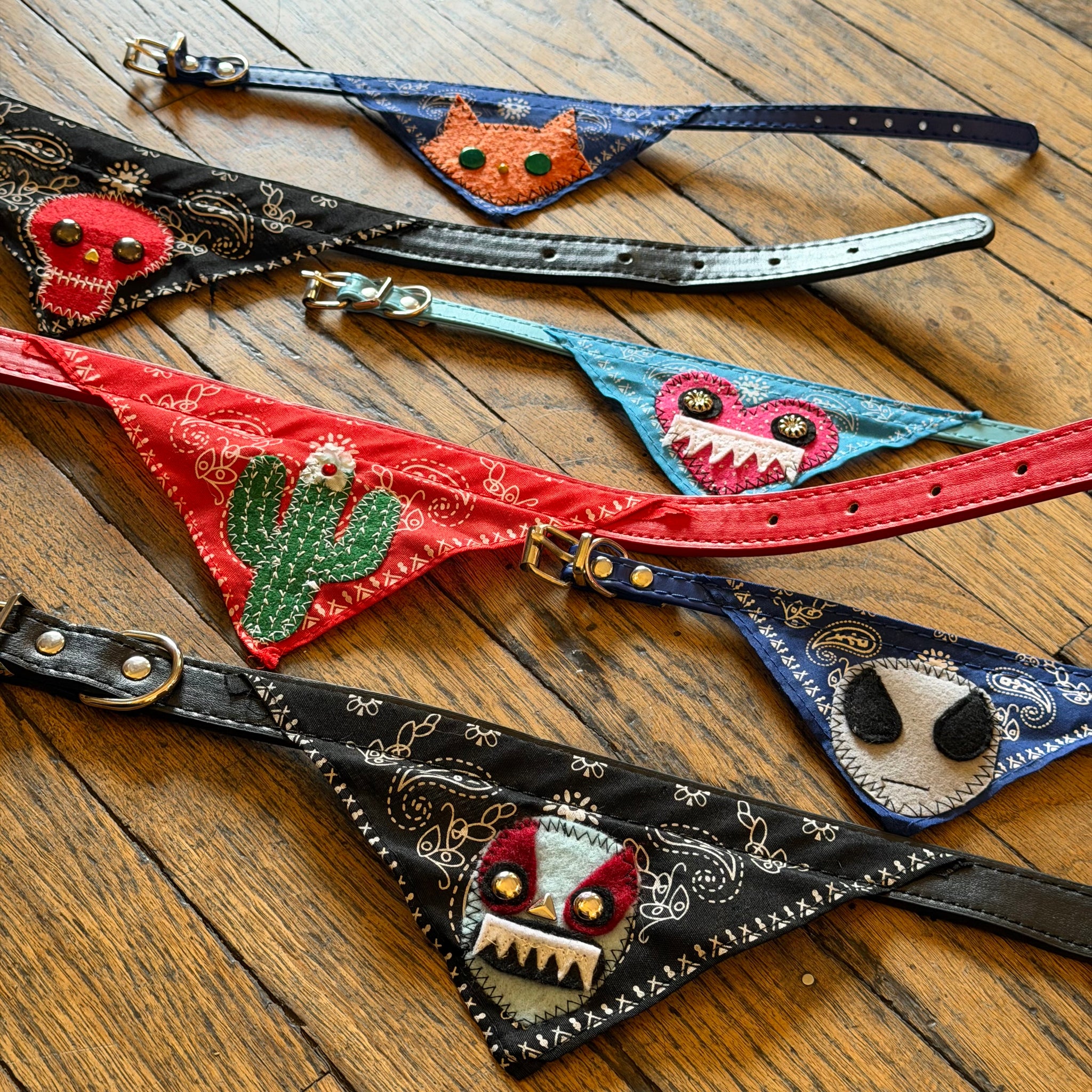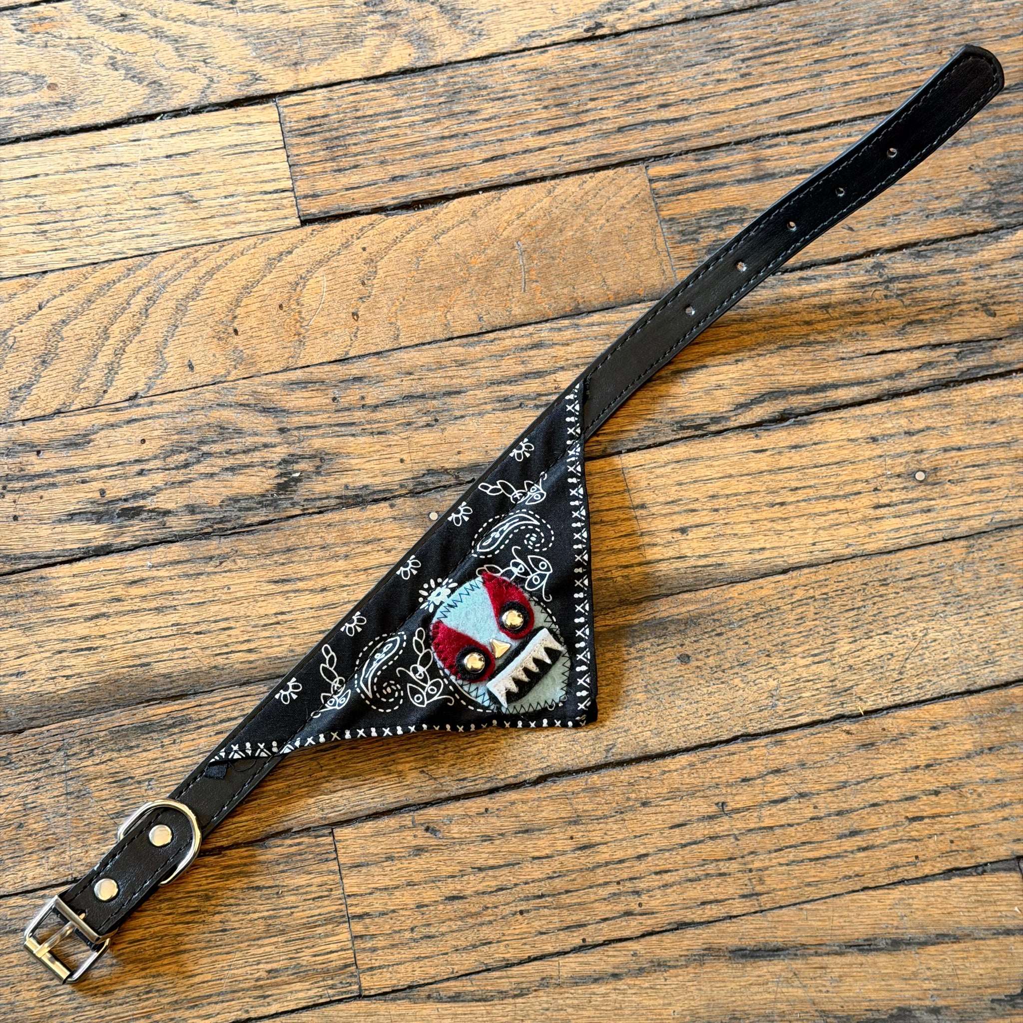 These faux leather collars include a little extra bandana style accent, featuring a handmade patch by Jen of Monster Booty Threads! Comes in two sizes, great for cats and small to medium sized dogs.