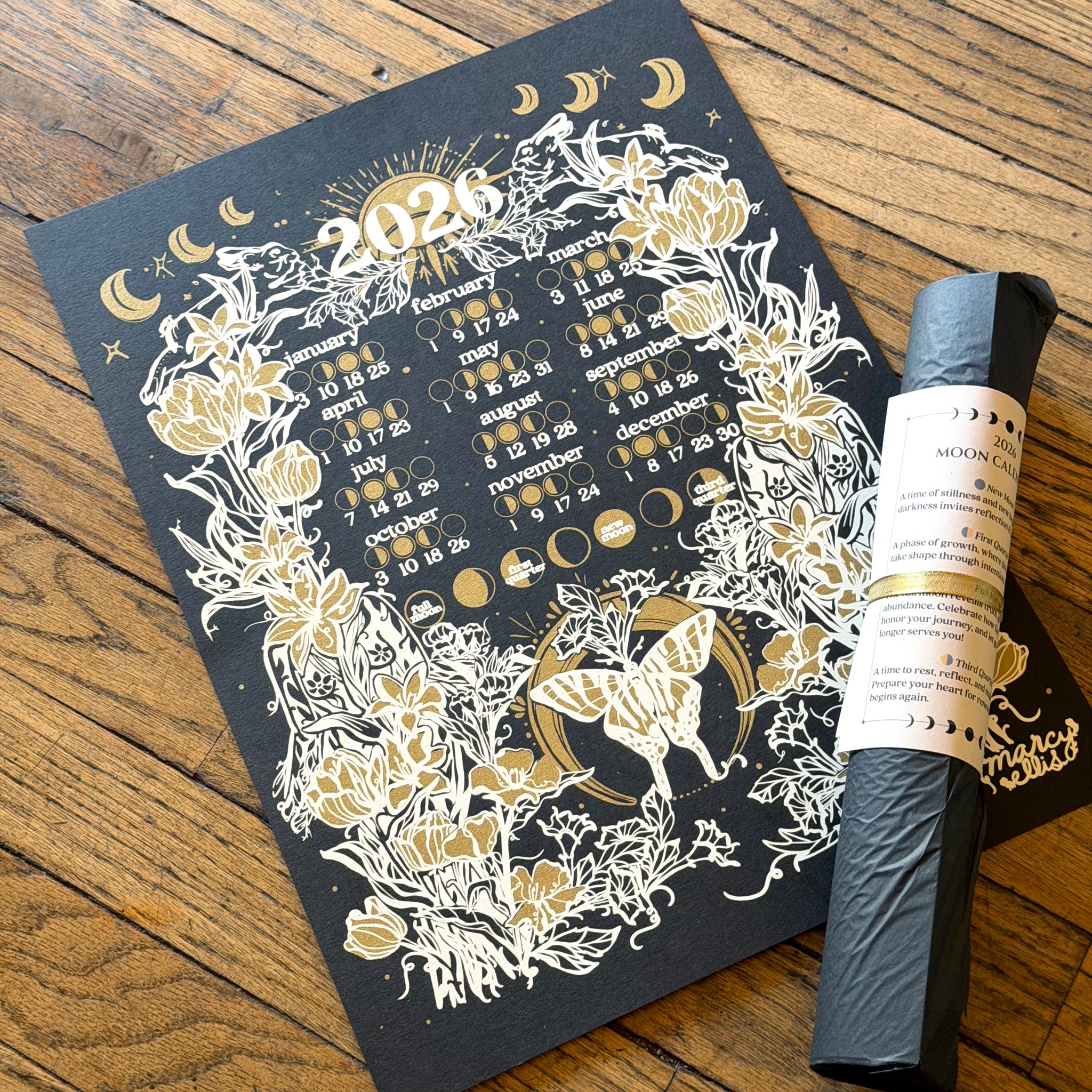 Celebrate all the phases of 2026 with these hand-screened moon calendars designed by Marcy Ellis! A longtime local creator, and friend of the shop, Marcy is famous for her botanical women designs found in prints and tattoos seen all over town. Every year she turns her trademark style towards designing a limited edition moon calendar, and her 2026 piece is another knockout! Screen-printed on thick parchment they're sturdy enough to hang up on their own, but they look great in a frame too. Choose from two options, each printed on sturdy 80lb paper: off-white with black & gold ink, or black with white & gold ink.