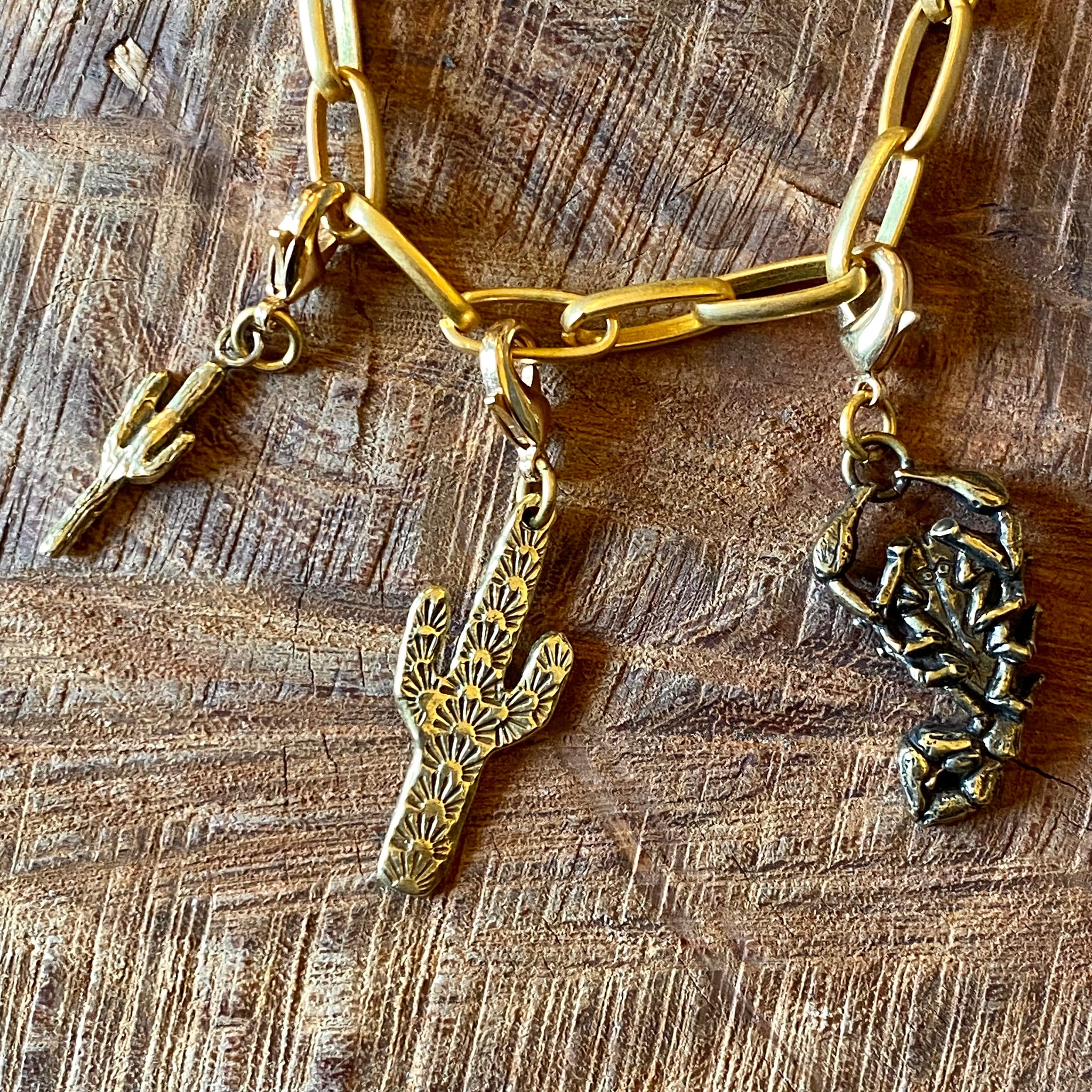 These dainty brass charms are perfect for your Southwestern Minimalist aesthetic! Handmade by Spring of Heliotrope, here in her Tucson studio, choose from two styles of saguaro, or one of the desert's most iconic creatures: the scorpion! Cast from brass, with a brass clasp.