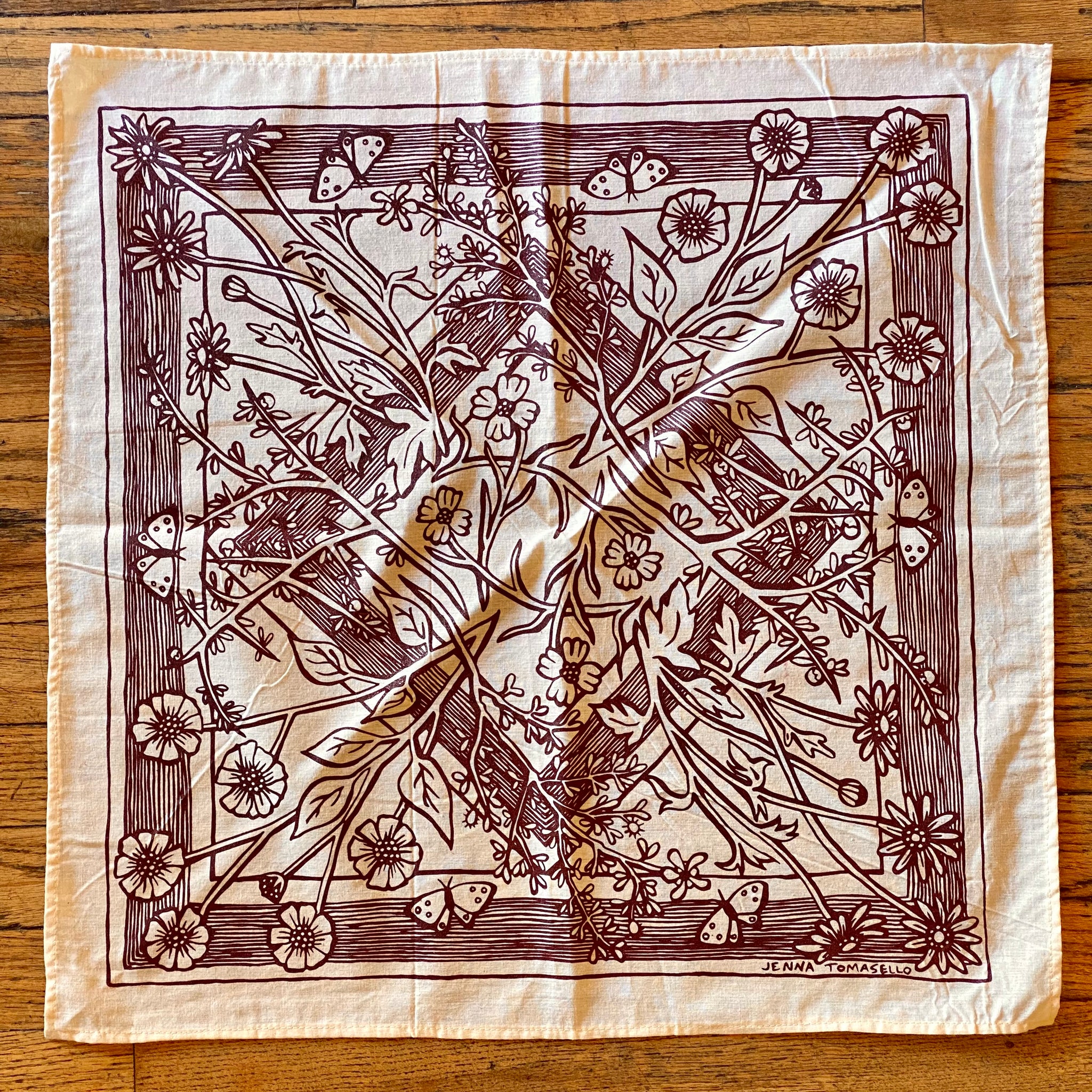 Burgundy - "Winter Friends" - The Winter Flowers Bandana is a pattern of desert flowers, Brittle Bush, Hairyseed Bahia, Wolfberry, Creosote, and Paper Flower.