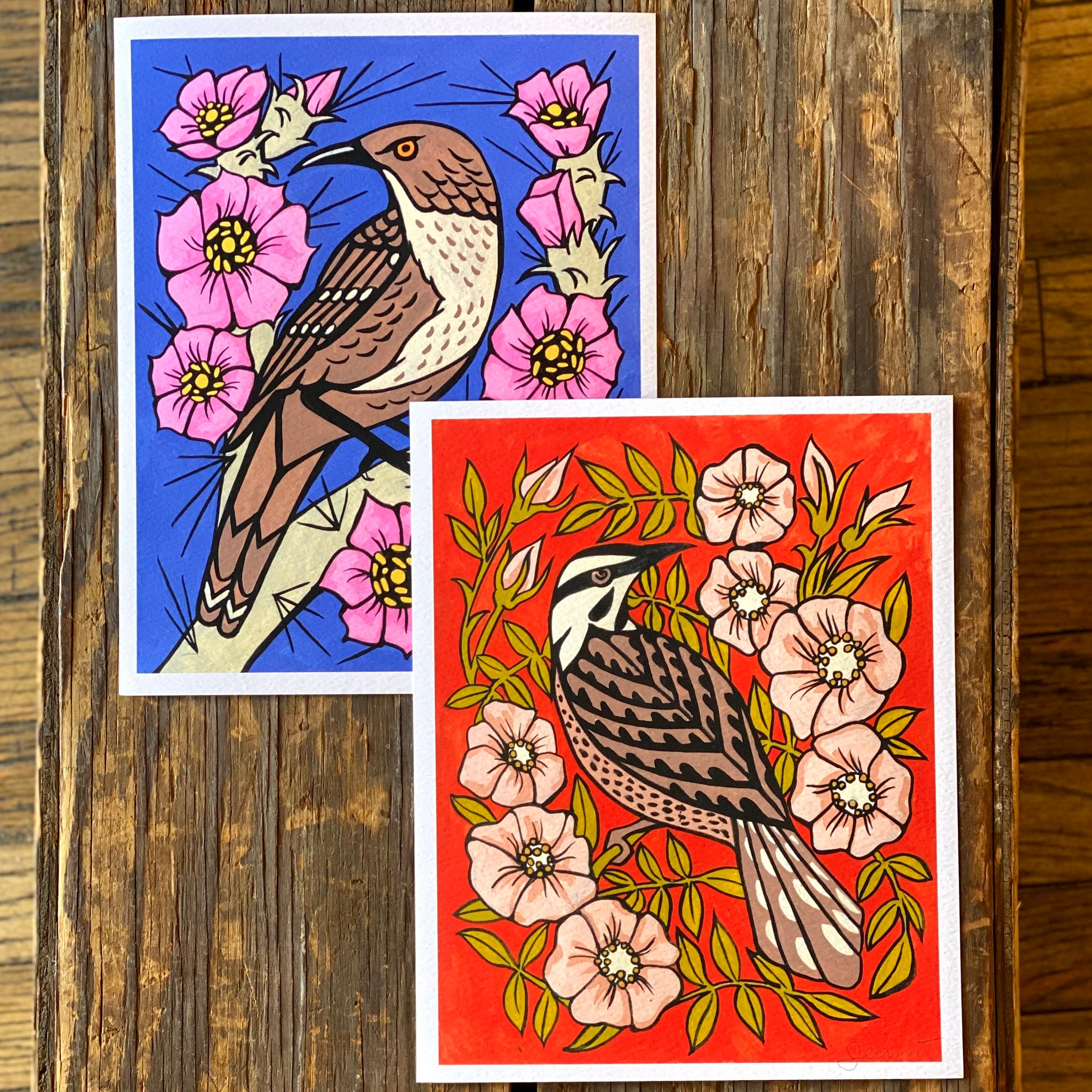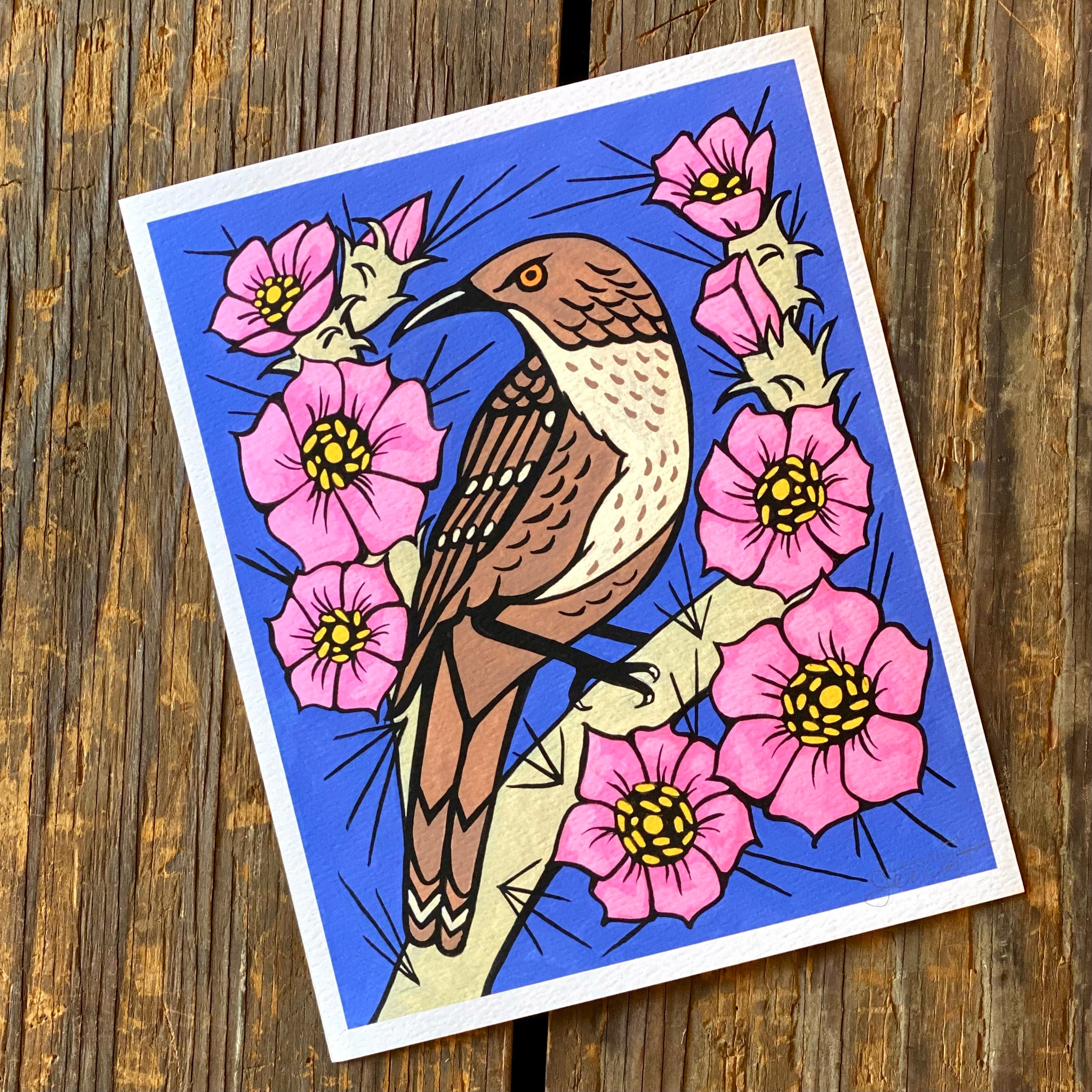These native desert birds have never looked so striking! Choose between two lavishly illustrated desert birds: the cactus wren and the curve-billed thrasher, each surrounded by native flowers set against a bright, colorful background. Bring a little desert wildlife into your home with these gorgeous gallery-quality prints by Tucson artist Jenna Tomasello!
