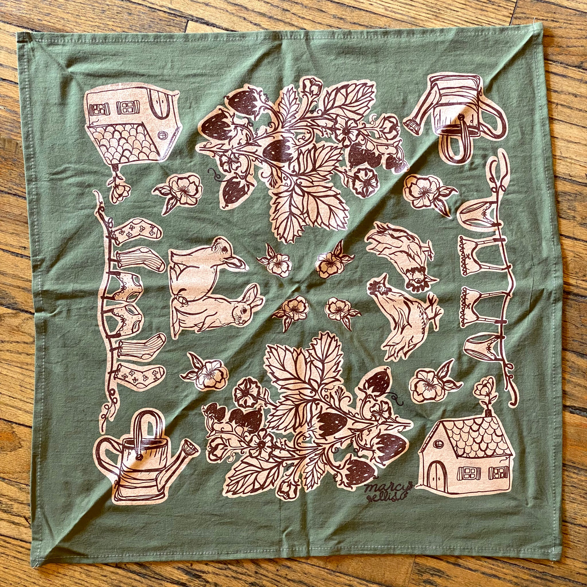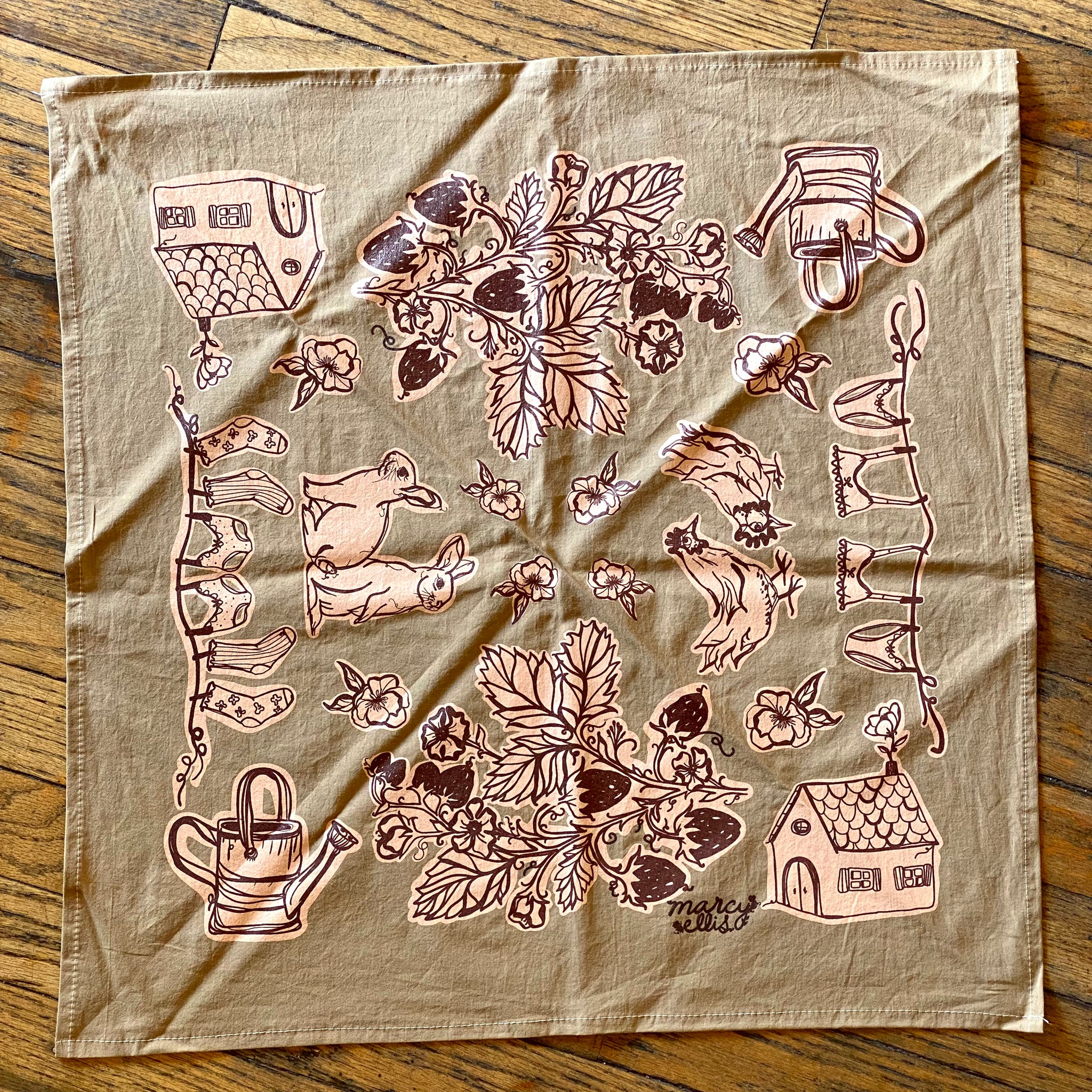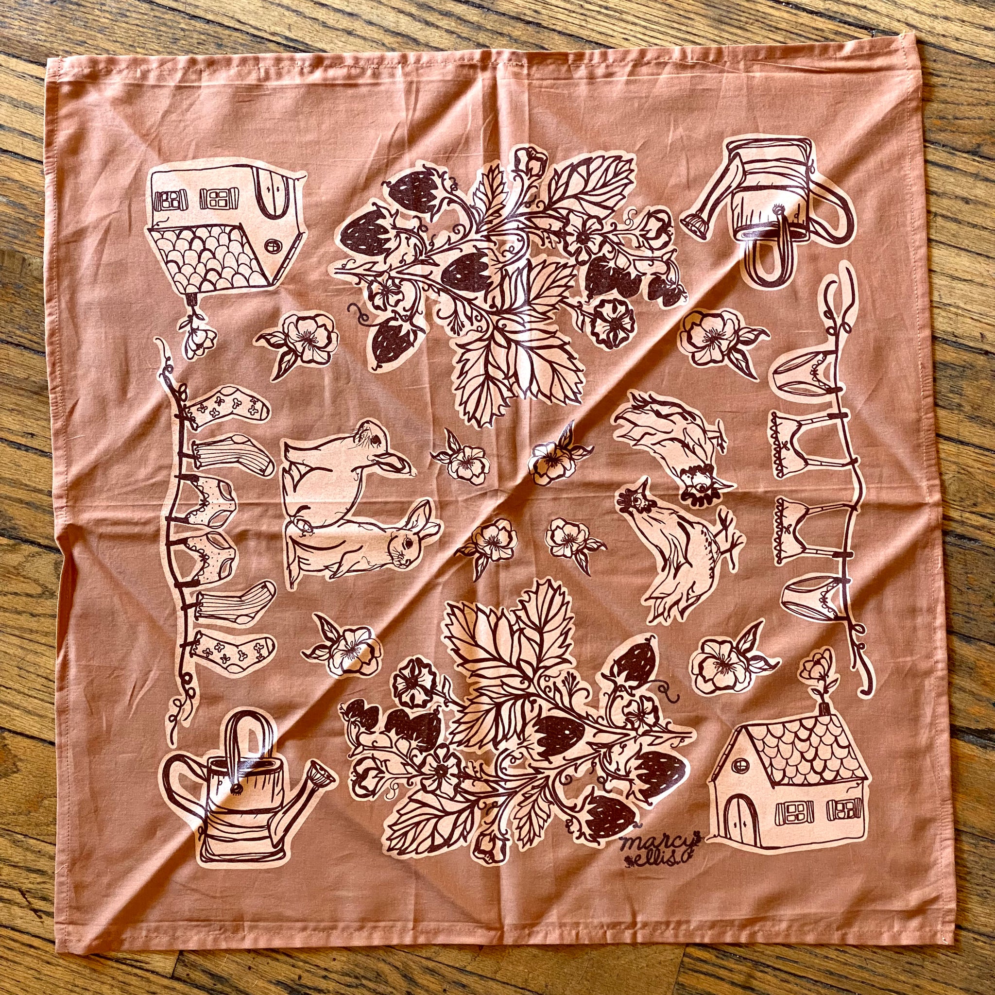 Printed on ultra-soft 100% cotton, these unique bandanas feature cute garden party designs by local artist Marcy Ellis! Choose from 3 different colors, each with the same adorable artwork.