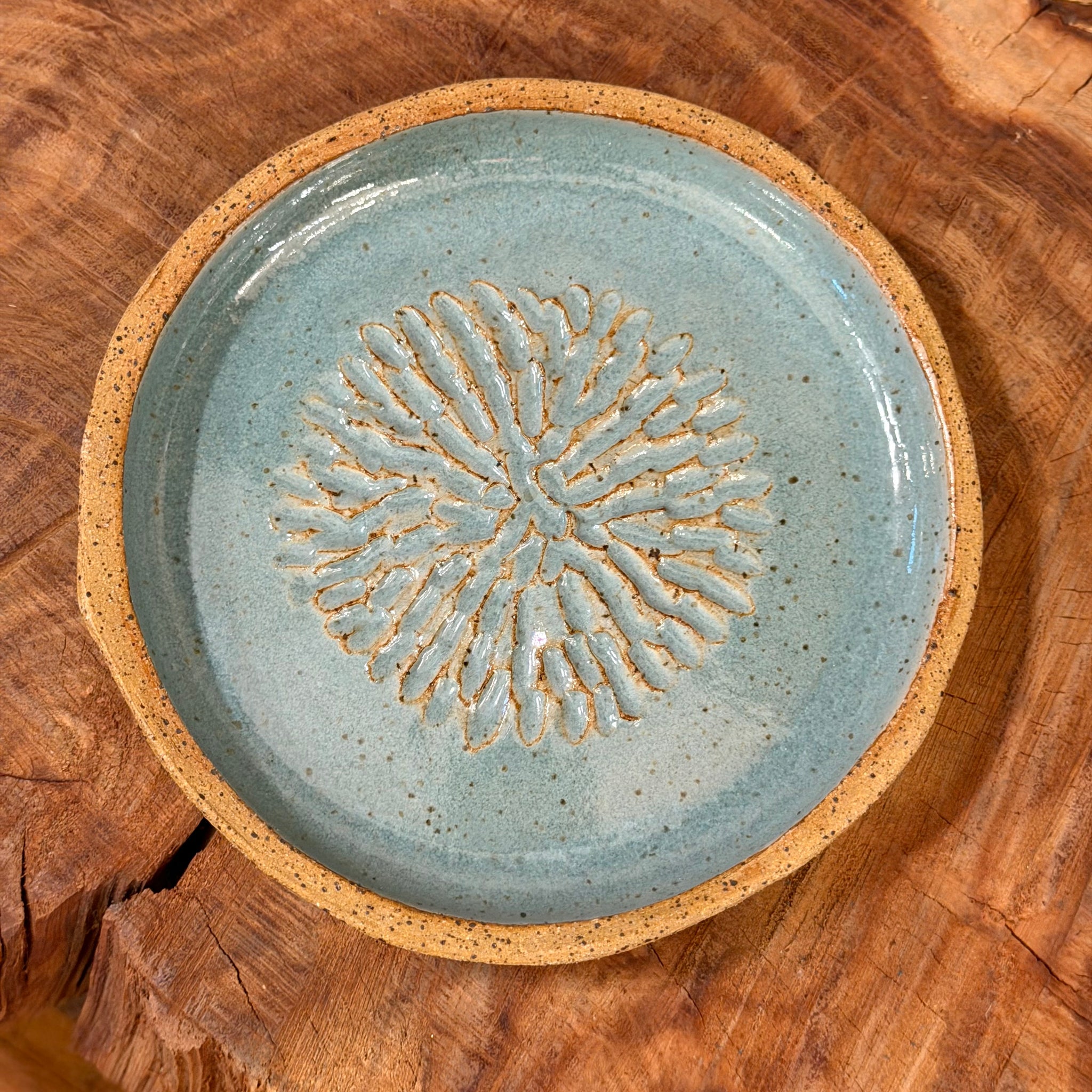 These handmade ceramic dishes feature a rough-textured center for easy garlic grating action! While grate for garlic, the beautiful blue glaze makes for an attractive snack platter too. Food safe glaze!
