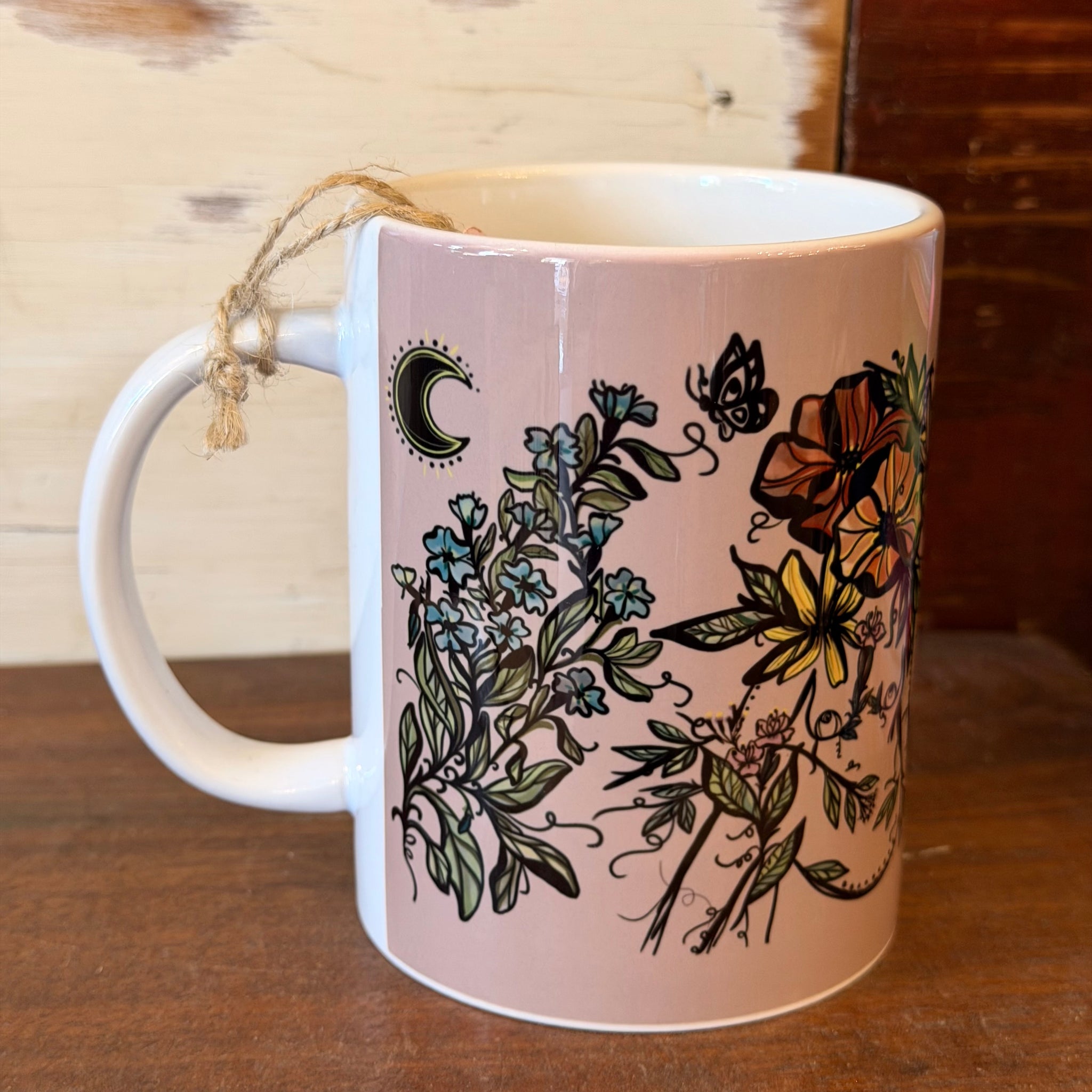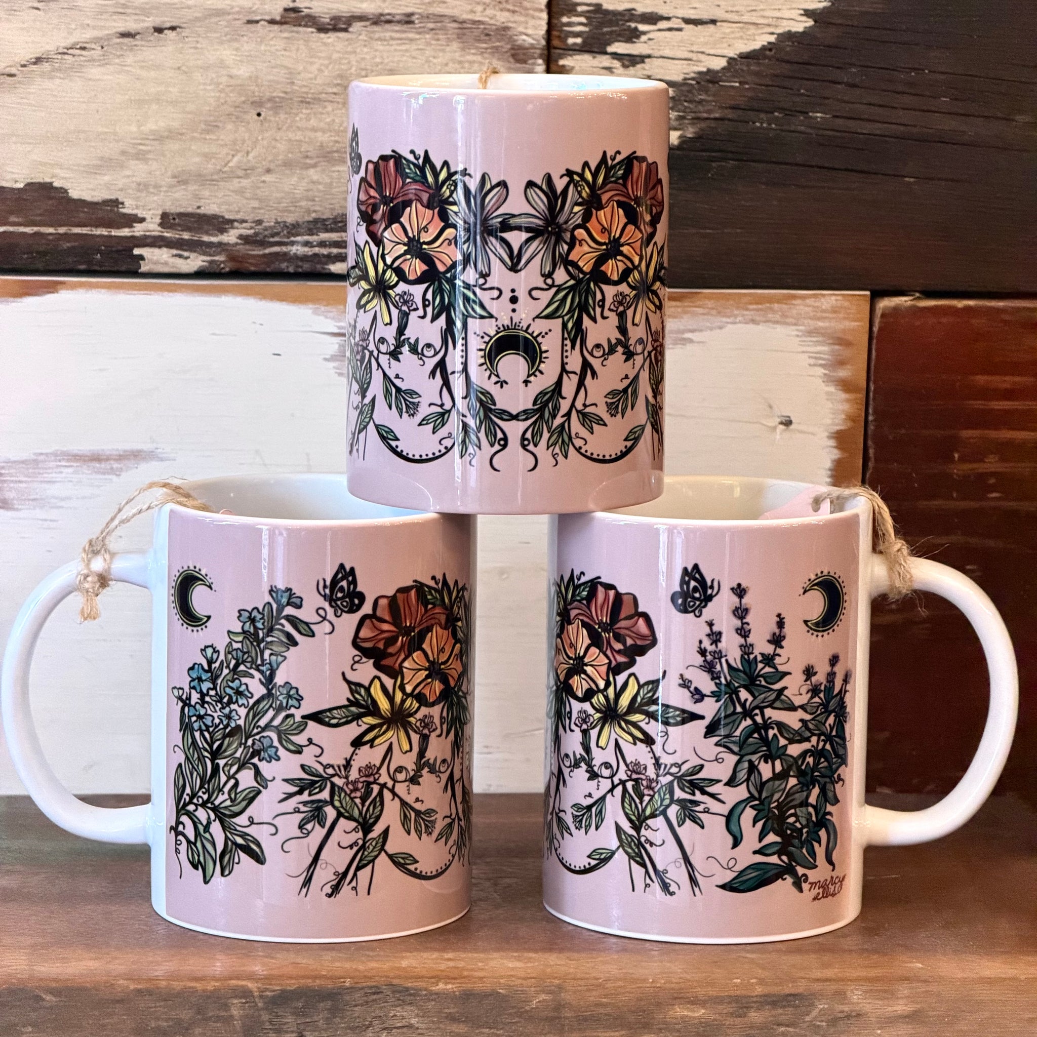These smooth finish 15oz mugs feature a vibrant printed illustration from local artist Marcy Ellis! Featuring bright and colorful purple, red and yellow floral sisters with moths and crescent moons, they're dishwasher and microwave safe. Part of Marcy's Flora Sisters line!