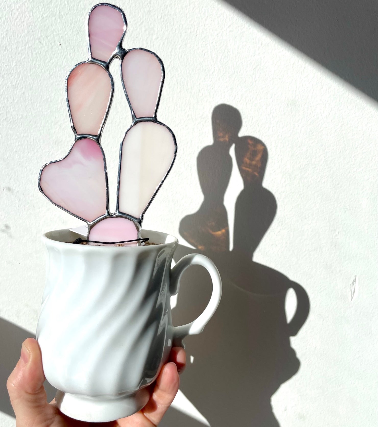 Cacti made from recycled + reclaimed glass, planted in reclaimed cups and mugs.