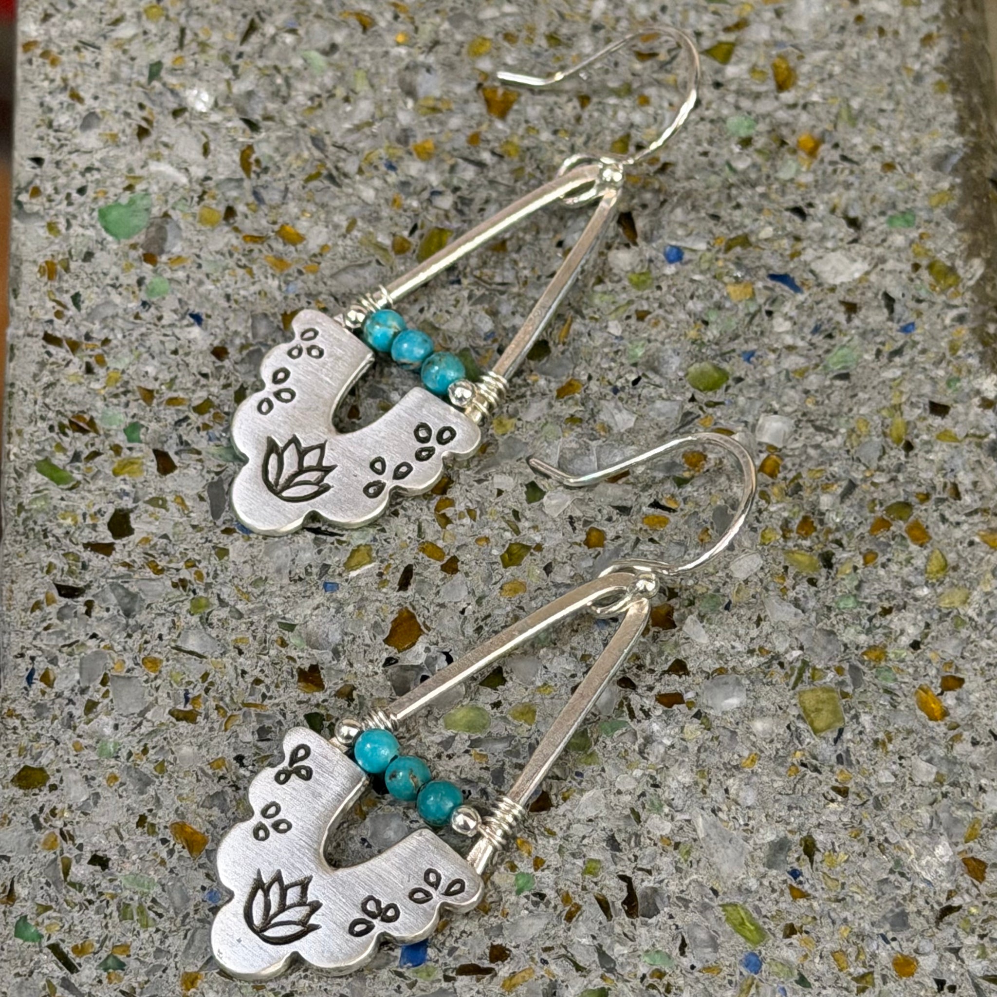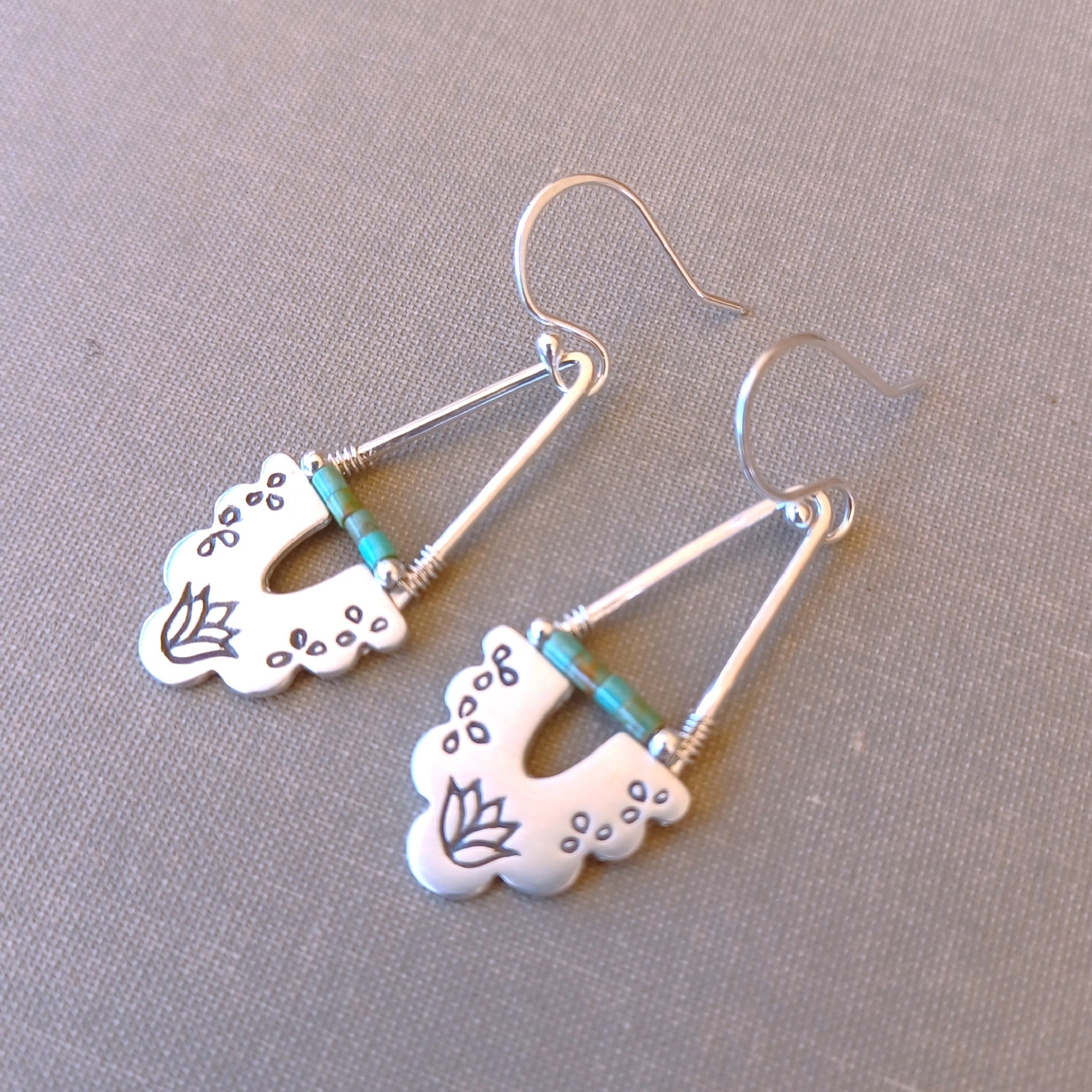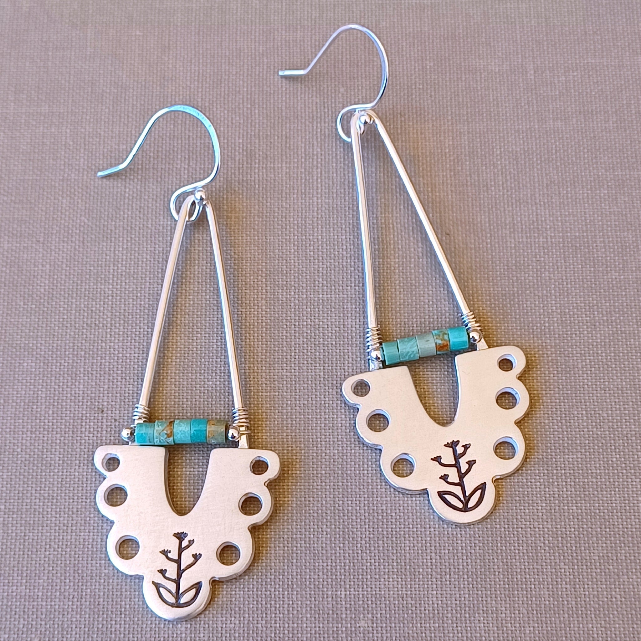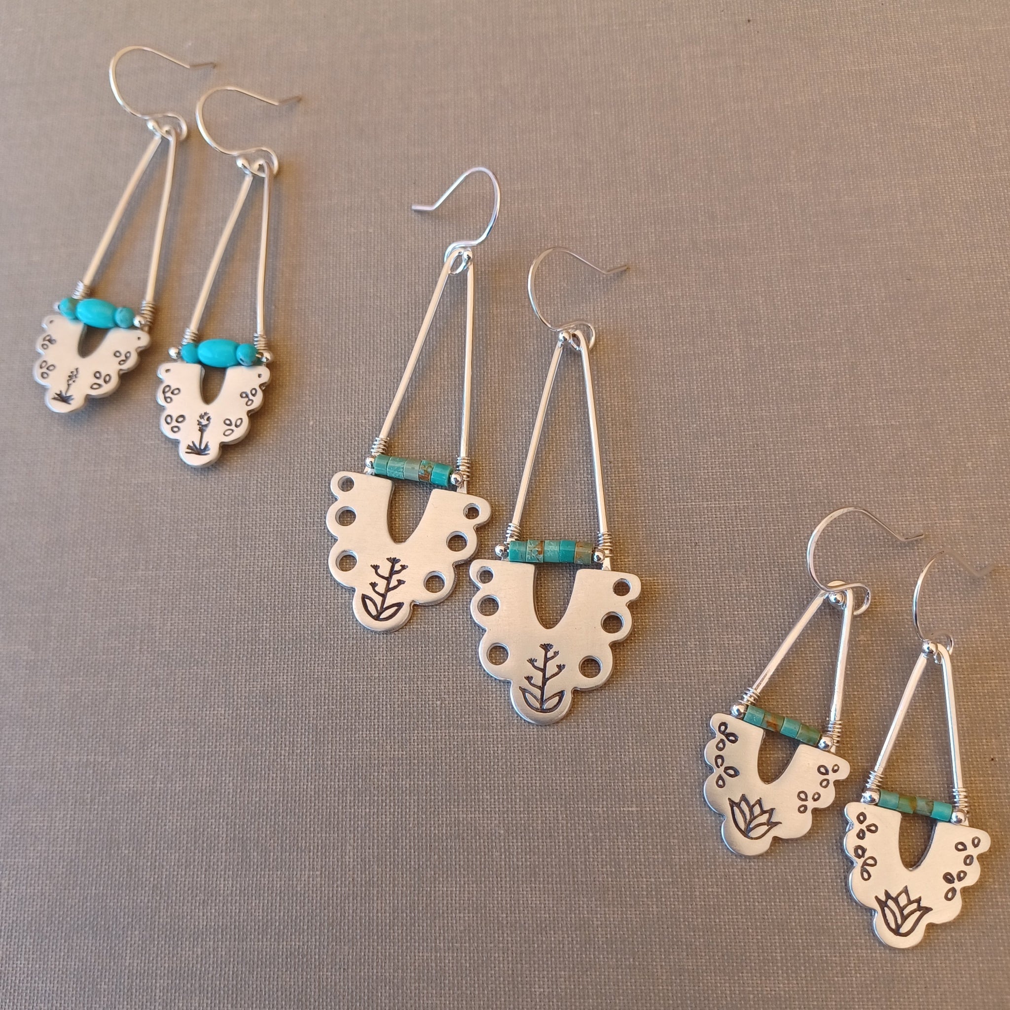 Lightweight, ornate and with a classic papel picado design, these sterling silver earrings are one-of-a-kind! Featuring hand carved details and turquoise accents, their unique triangular shape is eye-catching with a simple elegance. Handmade right here in Tucson by Celeste of Cactus Bloom Design!